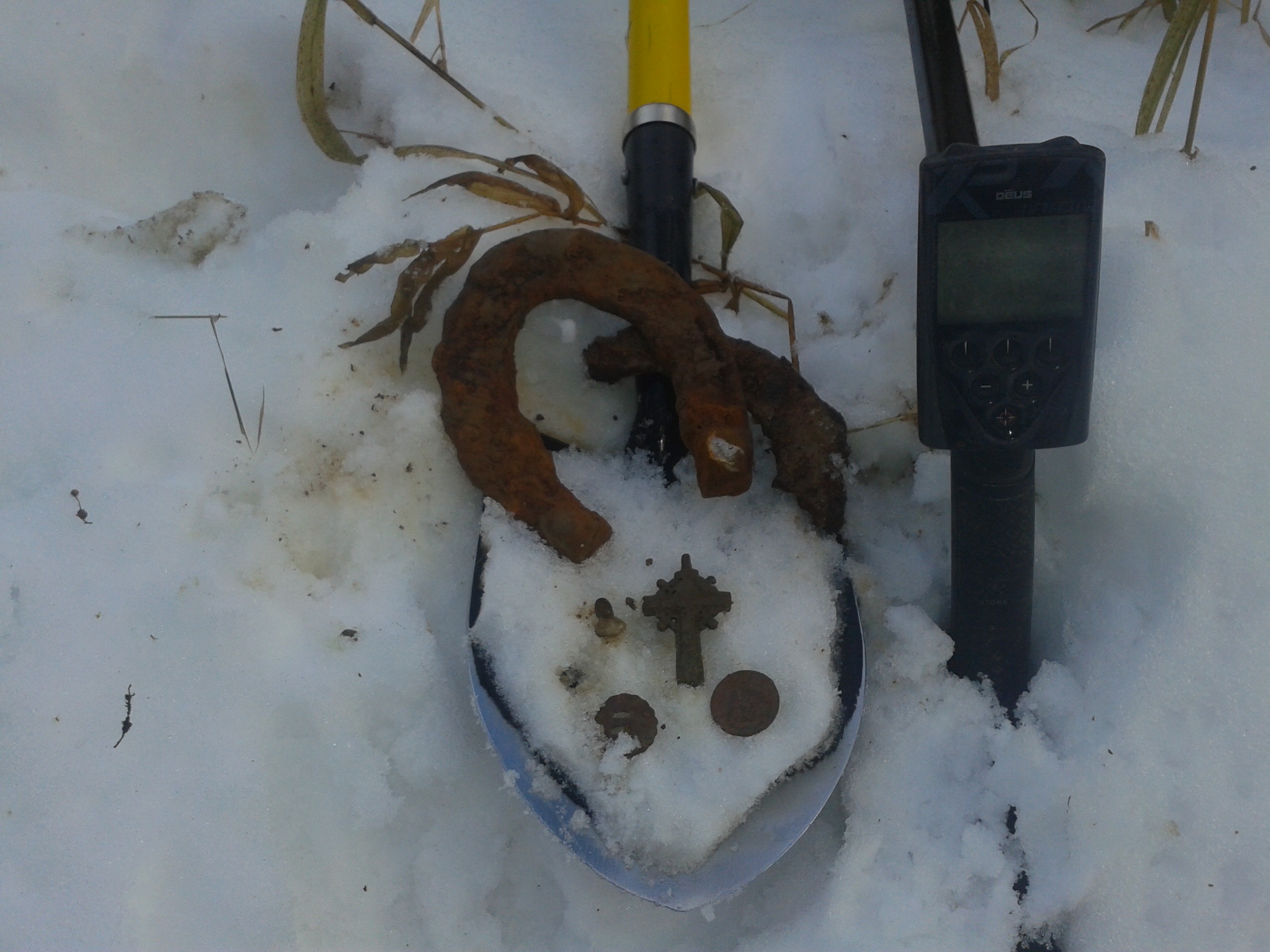 3-его января, снег выпавший перед Новым Годом согрел землю. Земля в лесу оказалась копаема. Походил часика 4-е. Конечно при слое снега 15-20 см не очень. Но настроив Деус даже не самые макс. настройки в итоге открыл сезон, пусть небогато, но и не ... Однако мощи Деусу хватало с избытком.