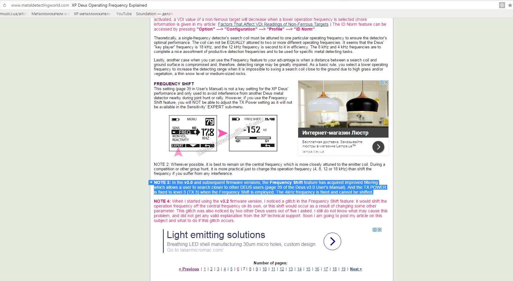 Вот тоже могу предоставить: Примечание 2: по возможности, лучше оставаться на центральной частоты, которая в большей степени приспособлена к катушке излучателя. Во время соревнований или другой группе, он является более практичным только для изменения частоты (4, 8, 12 или 18 кГц), чем сдвиг частоты, если вы страдаете от любого вмешательства. Примечание 3: В В3.0 и последующих версиях прошивки, то сдвиг частоты функция обзавелась улучшенной фильтрацией, которая позволяет пользователю искать ближе к другим ДЕУС пользователей (страница 39 из Деус В3.Руководство 0 пользователя). И мощность передатчика устанавливается на уровне 3 (ТХ 3), когда Частота смены работает. Частота 4кгц является фиксированной и не может быть сдвинут. Примечание 4: когда я начал с использованием В3.2 версии прошивки я заметил глюк в сдвиг частоты функция: это будет сдвиг работает на частоте от центральной частоты самостоятельно, или этот переход будет происходить в результате изменения некоторых других параметров. Этот глюк был замечен двумя другими пользователями Деус из пяти спросил я. Я до сих пор не знаю, что может вызвать эту проблему, и не получили никаких убедительных объяснений от ХР технической поддержки. В ближайшее время я собираюсь разместить Мои статьи на эту тему и что делать, если этот глюк происходит. Взято с этого сайта Сообщение отредактировано Мастак: Feb 9 2017, 15:48 Вложенные эскизы изображений -------------------- Denken Sie an die guten, und alles wird gut!