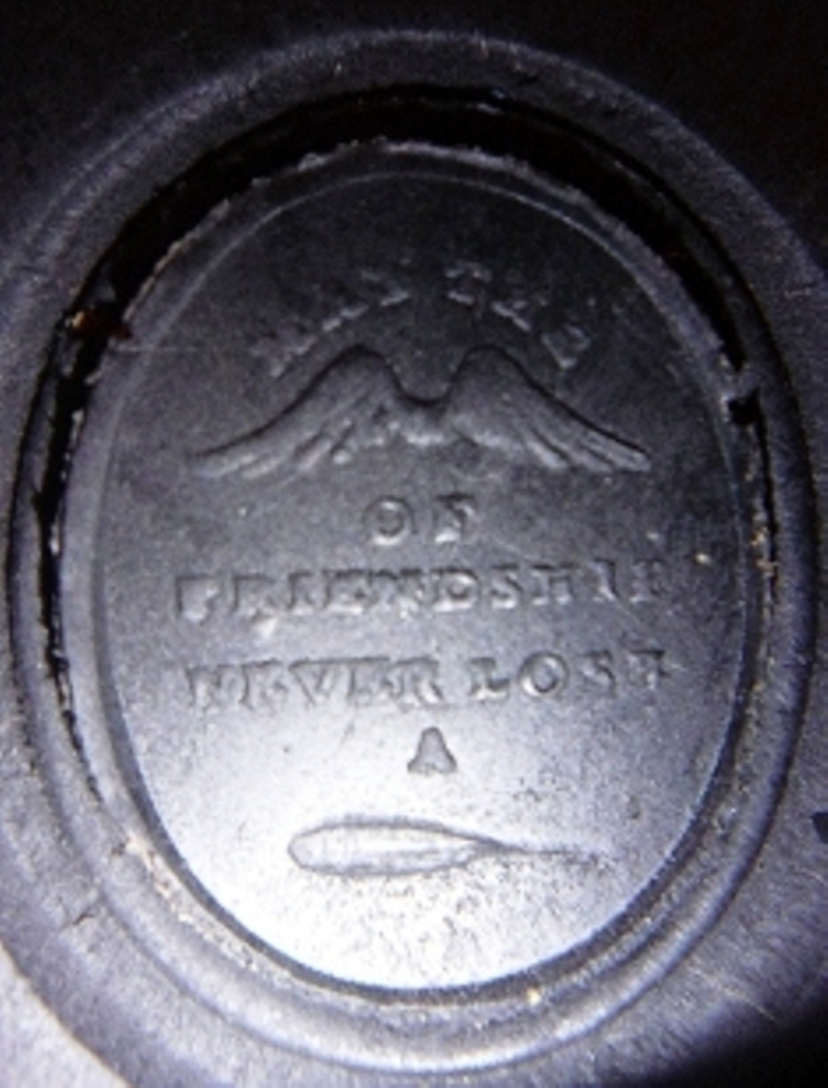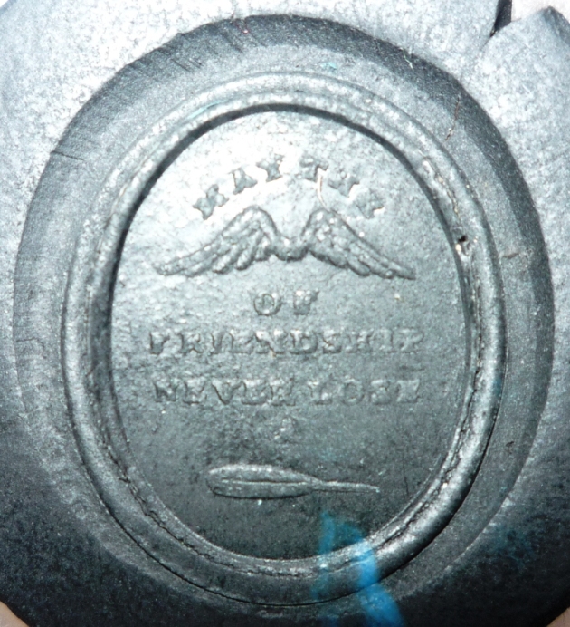 Надпись на английском выполнена в виде ребуса - некоторые слова заменены изображениями. Полностью звучит: "May the (WINGS) of Friendship never lose a (Feather)" - "Пусть крылья дружбы не теряют перьев" (в моем литературном переводе Сама фраза из одной шотландской книжки середины 19 в. В англоязычных странах используется до сих пор, в том числе на ювелирных изделиях. Думаю в нашем народном творчестве надпись соответствует фразе, что наши бабушки писали на письмах: "Лети с приветом - вернись с ответом" |