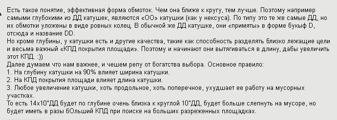 QUOTE(Gorr @ Feb 18 2017, 18:37) Мне то для универсальности с какой частотой нужно? Например Minelab X-TERRA 705 (катушка DD 10.5") подойдет? Судя по многочисленным данным наиболее универсальный и ходовой диаметр круглых катушек находится в границах 9"-11". На что в основном и ориентируются производители\продавцы. Катушки более больших размеров повышают скорость прохождения больших открытых полей и так называемых распашек. Нередко приходит ощущение прибыли также и по глубине. Катушки маленьких диаметров прекрасны в ограниченных и замусоренных пространствах, особенно когда ими приходится тыкать в узкие щели и ямки в таких местах, которые по тем или иным причинам даже не возможно дополнительно растопырить. Такими катушками также удобно проводить по вертикальным позициям в разрушенных и заброшенных помещениях. Ниже приведены цитаты по поводу размеров и форм катушек одного уважаемого копаря-форумчанина, к словам которого очень даже не грех прислушаться Вложенные эскизы изображений |