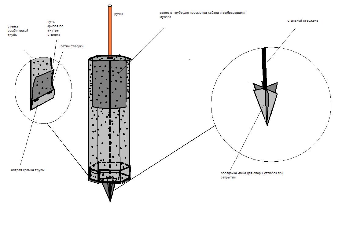 QUOTE(забулдыг @ Feb 4 2011, 21:31) Очень тяжело бывает достать с глубины предмет если песок осыпается. Сёдня придумал не оч сложную констукцию. Идея такая. Суёшь в место где сигнал трубу. А когда вытаскиваешь у неё створочки внизу закрываются как диафрагма и хабар в ней остаётся. Нарисовал как смог. Навряд ли получится глубоко загнать эту штуку в грунт рукой. Надо к ней педаль приделать,чтоб ногой нажимать. -------------------- есть ганд.н , есть презерватив . один из них-человек.