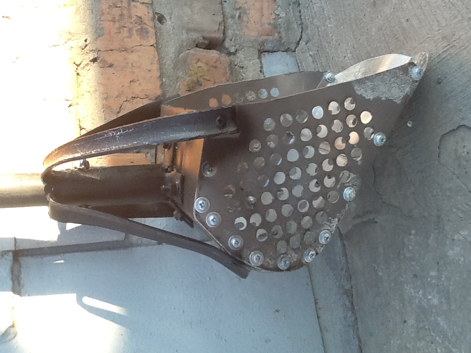 Вот мой скуп,сделанный своими руками. Толщина нержавейки 1мм, Сам ковш вырезан со днища корпуса старой советской стиральной машины. Скреплен обычными болтами. А вот с усилением конструкции пришлось поразмыслить. Распустил трубу из металла, с обоих концов по 4 полоски. Одна сторона прикручена к основанию,другая по углам.+служит держаком для ручки. Труба: длина 45 см. толщина стенки 3 мм. внутренний диаметр 3.5 см. Ручка обычная длинная для тяпки. вскрыта несколько раз краской из баллончика. Конструкция получилась реально жесткой,испытания покажут......))))) Вложенные эскизы изображений -------------------- Сомневаешься? Копай!