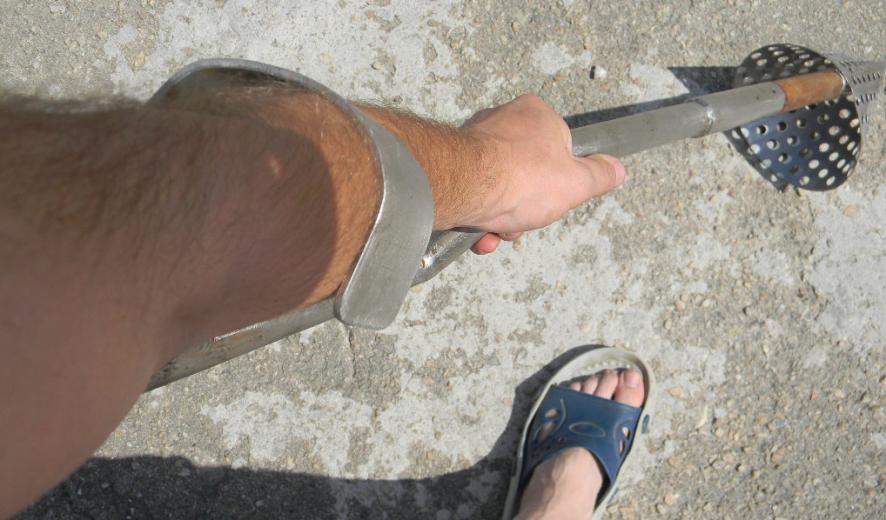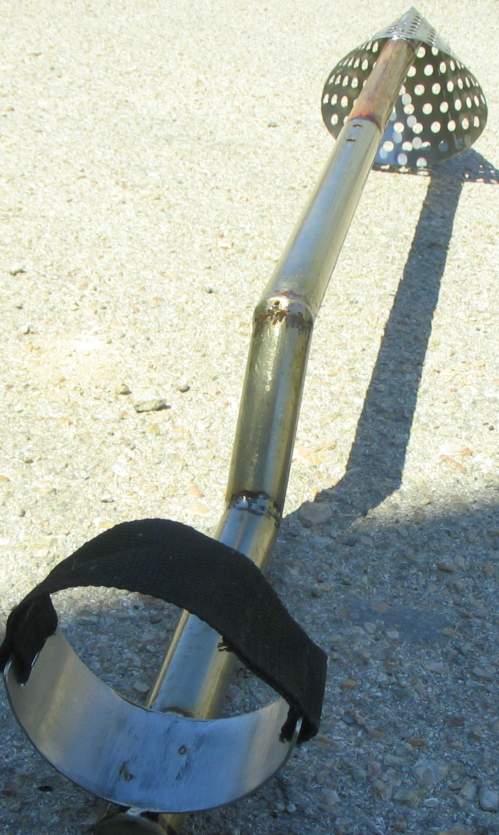 Кто интересовался приспособой к моему конусу, смотрите. Ранее на штанге стоял подлокотник как в МД и сверху фиксирующий ремешок (см.фото). Копать было неудобно, потому что без ограничителя сверху нажать на конус невозможно, но если ограничитель сплошной, то нельзя быстро высвободить руку поднимая конус..... Теперь же при "выгребании" цели с дна есть упор для руки и в то же время, оставлен зазор чтоб рука мгновенно высвобождалась при подьеме конуса для выемки цели. Несколько раз пробовал, реально удобно. Если кто надумает повторить, основное внимание нужно уделить выбору угла наклона ограничителя, он должен касаться руки именно плашмя, иначе будет неприятно врезаться в руку, мне пришлось пару раз примерять, чтоб вышло как надо.