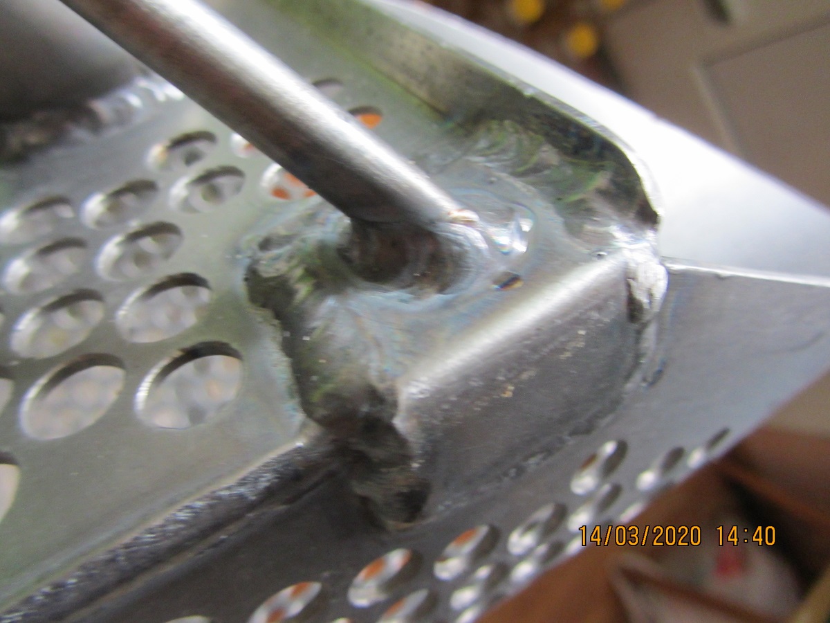 эти усы слабое звено любого скупа и из любого материала. Когда Вы наклоняете черенок вниз, зарытого скупа, выкапывая цель,львиная часть нагрузки приходиться как раз на передние усы. К сожалению многие изготовители страдают отсутствием знаний о сопромате, копе, но со временем опыт приходит. Я, например вижу что в свое время по такой схеме крепления некоторые производители делали и железные и нержав-ые скупы. А лишь в дальнейшем стали заворачивать пруток за угол верхней площадки и крепить швом к полусфере.. Эти снимаются деформационные напряжения плюс имеется большая длина сварного шва. Вырвать такой вариант крепежа -это вырвать угол скупа с мясом, что нереально. Вы могли бы и сами заострить внимание производителя на этом моменте, но не виню -все не учтешь. Вот еще вариант (на фото) усиленной площадки, хотя по мне проще завернуть пруток. Это мой скуп. Производитель часто здесь, на теме. То есть дело не в титане..