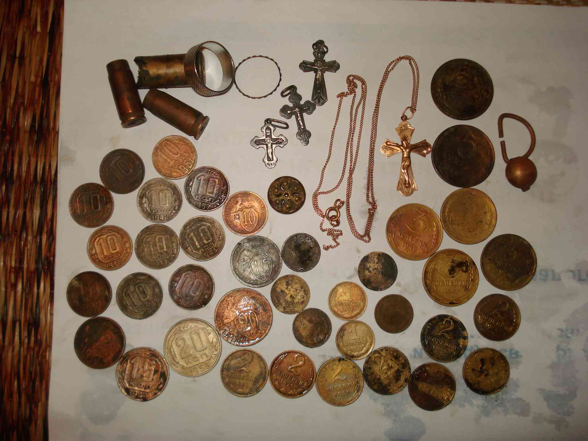 Пляжным поиском как то не интересовалась, но тут пригласили на спущенный пруд, выехать в поля не получалось,по копу соскучилась вот и согласилась с большим воодушевлением. Получилась так сказать, проба пера(и поиск новый и мд. новый.) 20 копеек 1953 , как из кошелька ,даже и не знаю чем объяснить. Естественно еще накопано пара кг. грузил, кормушек ,крышек и др. мусора. Но несмотря на огромное количество ямок конкурентов , находки выскакивали по две,три монеты из одного копка, а часть (в том числе цепочка с крестиком)из отвала предыдущего проходчика