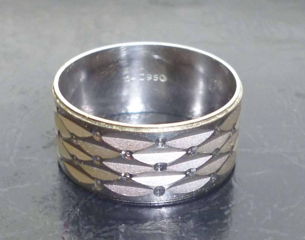 QUOTE(tepol @ Sep 17 2013, 08:01) Вот как! А совсем небыло увереноости в этом, на нержавейку грешил, только кислота зародила сомнения. Камней нет, внутри гравировка: OLESIA 14 05 2009, мужское, ширина 10мм, внутренний диаметр 20мм. Но появилась новая вводная, плотность показала 12,5 - 13. Мне кажется, что платина не вписывается в это. Пробник для 585 пробы реакции не дал. Я слышал про какие то медицинские металлы, которые тоже реакции с кислотой не имеют. А так очень похоже, что не с платиной, а с никелем. Я написал что означает пробирное клеймо, а там уж думайте сами У палладия тоже проба 950 бывает, но мне комбинированные клейма с палладием не встречались. Сообщение отредактировано ham: Sep 17 2013, 09:42 |