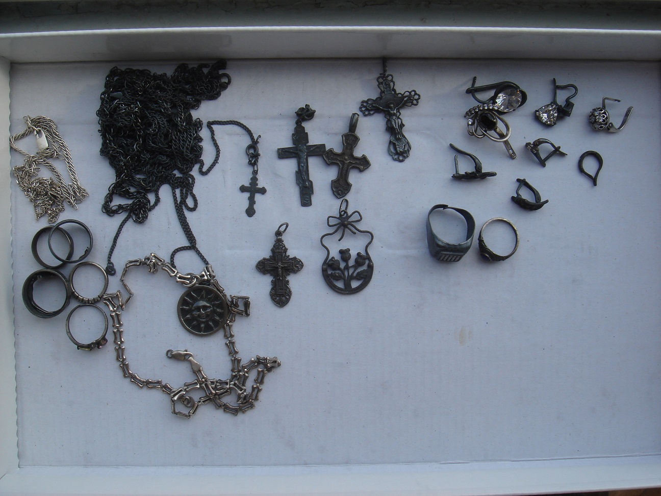 Приветствую всех Вас! Хочу немного рассказать о сегодняшнем копе. Фото специально не буду выкладывать дабы не травмировать ранимые души-поэтому будут только цифры.а верить или нет это Ваше дело. Ну с самого начала. После трудной трудовой недели на работе .решил сегодня с утречка прокатиться по новым неизведанным местам то-есть в соседний город.в надежде узреть какой либо новый пляжик или заход в воду благо вдоль реки есть дорога. Значит проехав практически весь город на окраине обнаружился небольшой песчаный пляжик примерно метров 10-15 в длину и сход к воде. Такая вот стандартная (бля-ая)поляна. Берег и полянка естесттвенно засрат всяким дерьмом бутылками . банками.и всяким мусором. Думаю приплыл-тоже самое будет и в воде.но делать нечего одел гидру.блок ГМП на голову и пошел. И тут началось самое интересное -вы не поверите на квадрате примерно метров 7на 10-12 мне сегодня удалось найти; пробки стальные-7 шт.пробки алюминневые-3шт. язычки от банок-4шт. железок было мало в основном заколки.денег-примерно рублей 400-450 точно не считал. и главное- белого металла в иэделиях 126,84гр и правильного 5 изделий на 12,22гр .3 обруча и 2 серьги. особенно порадовал привет из 80х на 7,14гр 583 . Я никогда так не отрывался по полной короче нарвался на колондайки никогда не подумл бы что там такое возможно.Из воды не вылазил с 11утра и до 11 вечера. Буду искать еще такое место!