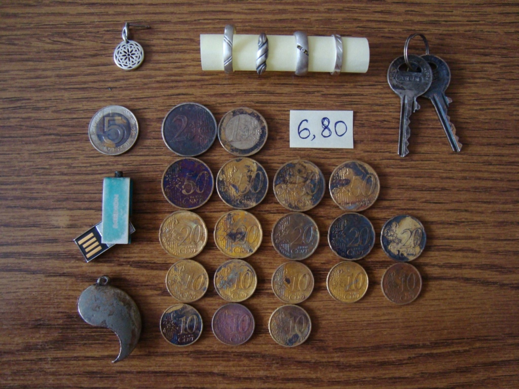Вчершний выезд доставил наслаждение копом. Температура воздуха чуть больше десяти градусов, и следовательно народ уже не желает гулять на природе, можно копать в спокойстии. Лишь случайные люди выгуливают собак, но они не напрягают. Выскочил стандартный набор, плюс флэшка. Сегодня проверил её, оказывается рабочая, пролежала похоже года три, т.к. все данные 2011 года на ней. До чего техника дошла, три года в воде и всё работает. Всем удачи.