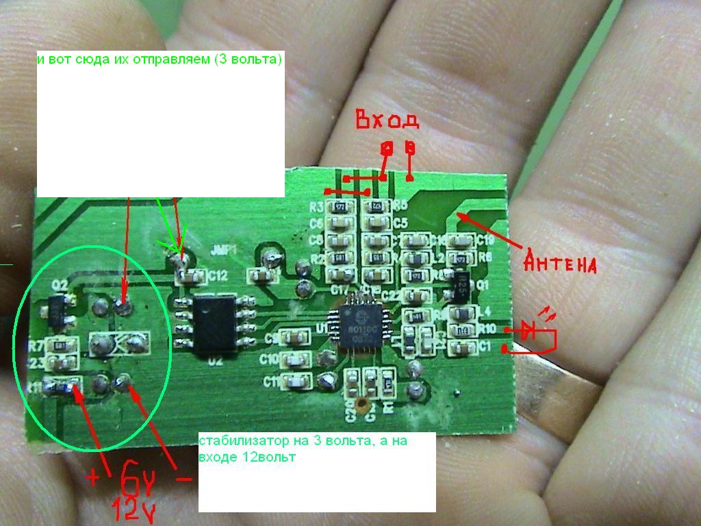 QUOTE(kava61 @ Jan 27 2012, 06:33) Делать на входе 12 вольт чтобы после стабилизатора было 3 вольта не может соответствовать действительности, максимум что может быть на входе это 5-6 вольт для стабилизатора на 3 вольта и трансмиттер работает наверное от двух пальчиковых батареек по 1,5 вольта. http://www.reviewdetector.ru/index.php?act...=post&id=723714 kava61 канкретно у девайса на фото с рождения было 9в |