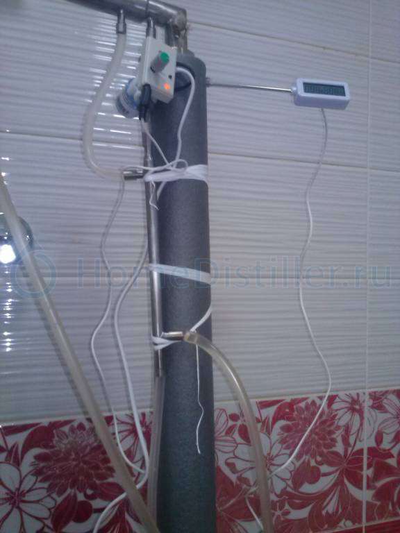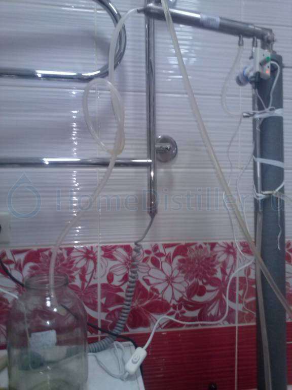 Отстаивалось у меня 7 литров 42 градусной жидкости. Сегодня выдалось время гнать на новом оборудовании. Пару раз до этого смотрел видео по НДРФ, поэтому, вопросов в сборке и принципах работы не было. Один нюанс - штуцера у клапана автоматики лезут в стандартную трубочку "с пролётом". Намотал на штуцера ленту фума и воткнул. Вроде бы как прочно. Оказалось, что ни фига не прочно - сначало слетело со стороны доохлаждателя, а потом и со стороны дефлегматора. Тёплый спирт, текущий по рукам и по клапану вещь не смертельная, но морально неприятная. В общем, всунул пока обратно так как есть и примотал всю конструкцию той же фума к царге. На этот раз сойдет, потом буду думать. Оставался один вопрос - какой режим будет рабочим для индукционки. До рабочей температуры догнал на максимуме - 2 кВт, а затем решил переключиться на 1 кВт. Так сейчас и работаю. Три часа отбирал 300 миллилитров голов. Капельности достиг при помощи будильника на сотовом - 16 - 17 миллилитров за 10 минут, что по моим расчетам соответствует требуемой. Пометку карандашом на клапане сделал - в следующий раз считать ничего не придется. Градусность голов - 97,8 (без замера температуры). Пахнут - мрачно, шибают в нос - ужасно. Таких мрачных голов не получал ни на дистилляторе, ни на ПК. В общем, всё работает, царгу слегка потрясывает, в петле булькает, температура пока везде стабильна. Третий час отбираю тело - набрал пока 2 с лишним литра - жаль, проходимость клапана невысокая - 0,75 л в час, но, господа - это ж спирт. Сейчас перепроверил - 96,5 процентов спирта при 23,3 градусах цельсия. Общая точная крепость в пересчете на 20 градусов цельсия составила 94,57 градусов спиртуозности. Ничего так... Вот так сейчас у меня выглядит конструкция в сборе. Снизу - куб. Он в фотку не попал. ![]() -------------------- Меня как копаря раздражают две категории людей - алкоголики и гармонисты.