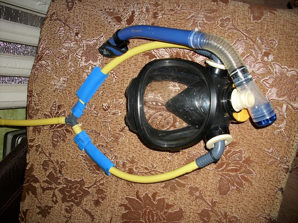 фишка 2 шлангов равномерный обдув стекла, сброс воздуха через нижний клапан, трубеа тоже идет через клапан как аварийная, при подъеме на поверхность дыхание идет через трубку, проблему пузырей не решал, свой марк переделал под световую индикацию, в качестве фильтра и ресивера пока пластиковый баллон он опрыскивателя, собираюсь ща сделать из баллона из под хладона, .ну и еще переделанный регулятор Dacor XL,