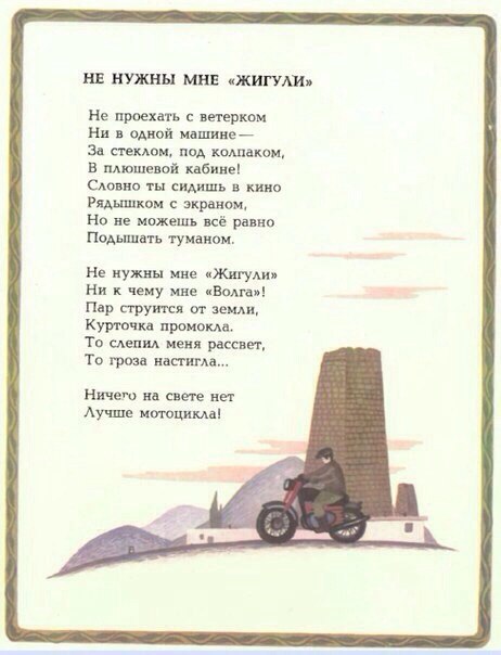 Решил я мот для копа приобрести, ну и хожу по своей большой деревне со всеми тру, значит эту тему.И разговорился значит с одним дедком, он и говорит: купи у меня мотоцыкл, за бутылку взял, за бутылку и отдам, только он не заводится, колеса потрескались и сиденье козушки съели! Я мол, спасибо , добрый человек, но я в них плохо разбираюсь и мне бы чтоб с колесами и сиденьем, а самому интересно , блин: говорю, а ты где его сам то взял, да еще и за бутылку? И поведал он мне такую историю. Сижу, говорит, на скамейке у дома, курю, смотрю сосед мотоцикл катит. Я ему кричу: - сломался что ли? Он говорит:- да зае...ал он меня в доску, не заводится на.. Ну я ему говорю, чтоб продал и не мучался, а он ко мне поворачивает, говорит забирай за два литра. Я ему: да на.. он мне сдался, да еще и за два литра. Ну говорит , забирай за литру. Я говорю, есть у меня бутылка, а он - согласен! А я, что выпьем ее вместе, неси , говорит. Ну, значит мы с соседом бутылку выпили, он домой пошел, а я мотоцыкл за катил в стайку к козушкам, чтоб дождем не мочило, там он лет пять и стоит, вот только колесы потрескались и сиденье козушки съели, а так за бутылку брал, за бутылку и отдам... -------------------- репутацию почты РФ уточняйте на почте РФ