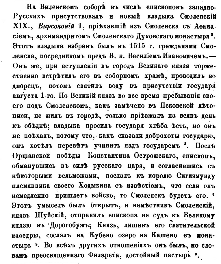 ВАРСОНОФИЙ († после 1514, Спасо-Каменный мон-рь?), еп. Смоленский. Из смоленских бояр. Поставлен на Смоленскую кафедру через нек-рое время после возведения на Киевский митрополичий престол (между февр. и сент. 1509) бывш. Смоленского еп. Иосифа (Солтана). 25 дек. 1509 г. В., уже как Смоленский архиерей, принял участие в Соборе епископов Западнорусской митрополии в Вильно, 18 янв. 1510 г. скрепил своей подписью соборные «Деяние» и «Правила». В листе кор. Сигизмунда I от 24 июня 1511 г. указывалось, что В. неправомерно собирал дань и пошлины с Мстиславля, подчинявшегося Полоцкому и Витебскому еп. Евфимию. Король обязал Смоленского владыку, «а што будет тое десятины, и куниц соборных, и присудов, и иных доходов побрал, то бы еси все ему поотдавал конечно». В 1513 г., после первой осады Смоленска рус. войсками, В. ходатайствовал у кор. Сигизмунда о ликвидации в городе корчем. В февр. следующего года епископ находился в Вильно, где вместе с митр. Иосифом подписал жалованную грамоту Супрасльскому Благовещенскому мон-рю, к-рый освобождался от пошлин в пользу митрополита. В июле того же года рус. войска вновь осадили Смоленск. В кон. месяца В. участвовал в переговорах о сдаче Смоленска войскам вел. кн. Василия III и просил, «чтобы государь князь велики их, вотчину свою и дедину, отдал им и пожаловал бы... велел им себе служити и с его вотчиною со градом Смоленьским, и старины бы их государь не рушил, из града бы из Смоленьска государь не велел розвести». В. добился выдачи смольнянам жалованной грамоты, подтверждавшей более ранние пожалования кор. Александра Ягеллончика (вел. кн. Василий III, в частности, обещал «не вступаться» во владения мон-рей). 1 авг. со Смоленской иконой Божией Матери архиерей встречал Василия III при въезде в город, В. благословил его крестом и отслужил молебен в присутствии вел. князя в Успенском соборе. После поражения рус. войск в битве под Оршей (8 сент.) В. послал в окт. 1514 г. к Сигизмунду I с письмом своего племянника В. Ходыкина, призывая короля скорее выслать к городу войска. Часть местных бояр и мещан выдала рус. наместнику замыслы епископа. Согласно др. версии, В. организовал заговор против Василия III еще до битвы под Оршей, зазывая «государя своего великого князя хлеба есть, и хоте над ним перевет учинити». По приказу кн. В. В. Шуйского в Смоленске был произведен обыск и перед приходом под город литов. войск кн. К. И. Острожского В. был арестован и отправлен в Дорогобуж, в ставку вел. князя. По приказу Василия III епископ сначала был сослан в Москву в Чудов мон-рь, а затем в Спасо-Каменный в честь Преображения Господня мон-рь на Кубенском оз. После этих событий его имя в источниках больше не встречается. Сообщение отредактировано oparysh: Oct 16 2012, 09:30 Вложенные эскизы изображений |