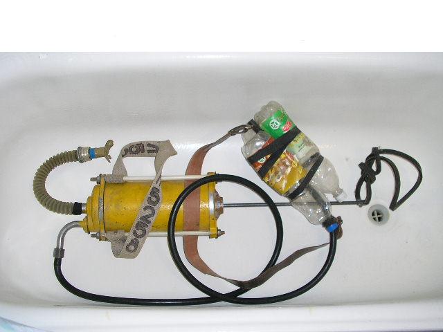 Шайтан-машина короче. Сомнительное удовольствие. Если только ноги качать: - по длине бутылки определяем, что длина шланга с поверхности около 2 метров - это 0.2 АТИ; - по диаметру гофрированной трубки видно, что диаметр поршня около 15-16 см; Тогда имеем Пи х R(см) х R(см) х 0.2 кгс/см кв = около сорока килограммов силы подвинуть на длину штока поршня. Работу поcчитайте сами И это на два-три вдоха. При этом работа тяжелая - легочная вентиляция около 90 литров в минуту, какой нафиг еще поиск при этом?! С уважением. -------------------- А что это вы тут делаете?