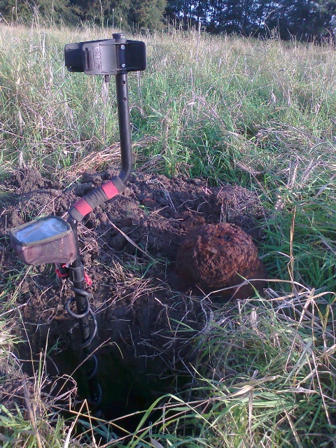По крупняку.Дернул каску.Ровно 80см было до купола.Сигнал четкий и сильный .Ещё до того как раскопать,делал отрыв катушки над землёй сантиметров на 35.Катушка 9,5*12,5 трехчастотка.Частота 14кГц Настройки свои по месту,но далеко не запредельные.