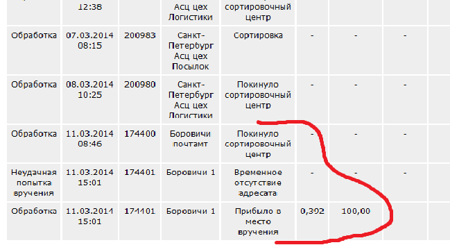 QUOTE(ZloyGnom @ Mar 14 2014, 22:54) Эхх, Сергей... Считай, что тебе повезло! У меня всего две строчки... Операция Дата Место проведения операции Атрибут операции Вес (кг.) Объявл. ценность (руб.) Налож. платёж (руб.) Адресовано Индекс Название ОПС Индекс Адрес Приём 12.02.2014 16:29 357538 Пятигорск 38 Единичный 0,129 - - 142605 Орехово-Зуево, Московская обл. Обработка 13.02.2014 20:15 357500 Пятигорск почтамт Покинуло сортировочный центр - - - Сообщение отредактировано Владимир OZ: Mar 14 2014, 22:14 -------------------- - Господи! Ну почему же ты помогаешь этому кретину? Почему ему, а не мне?! (Ротмистр Лемке)