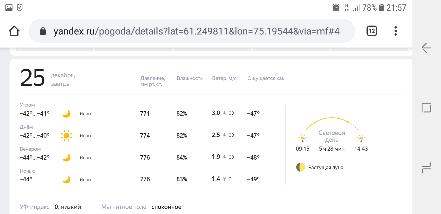 QUOTE(дима-з @ Dec 24 2020, 23:58) Доброго утра всем проснувшимся! А у нас красота, -42* туман стоит. А на работе под -50* будет. PS. Забыл показать прогноз на выходные... Сообщение отредактировано ul-hant: Dec 25 2020, 05:27 Вложенные эскизы изображений -------------------- ex RA4PTP, UA9JKI