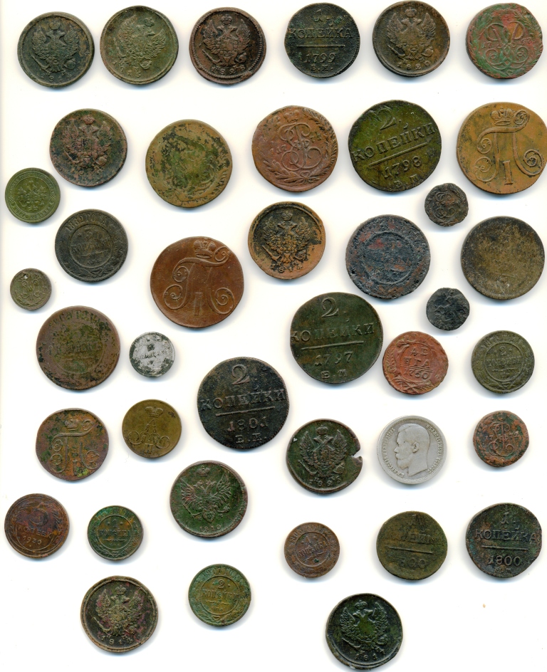Вот что лежало у меня на столе, здесь позавчерашний и сегодняшний (вчера спалось) сбор, без дырчатого серебра и элементов украшений. Пока сканил выбило компьютер, отсканил по новой. Среди сегодняшних находок радует двушка 1810 года с большой и малой короной, гурта "шнур".
