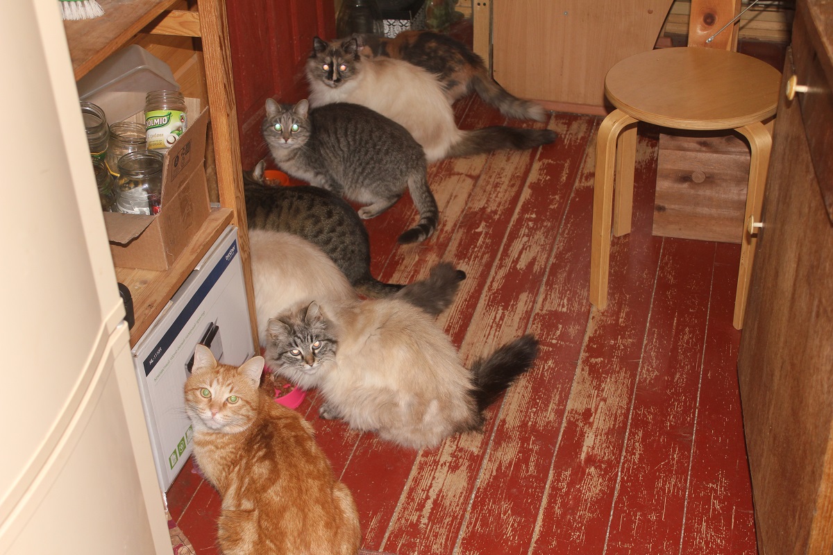 Всем доброго утра.Мой кошачий "спецназ" за утренним приёмом пищи