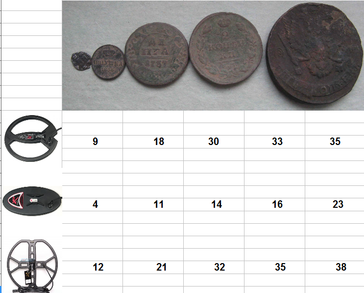 5 коп. Н2 10 коп. 1923 1 коп. Алюминиевая бронза 1 коп. Н2 3 коп. Алюминиевая бронза ВРП 27 катушка в той же последовательности в см. : 42 30 22 39 36 28 Сэф: 50 32 27 40 40 28 Результат неоднозначный, ещё раз говорю - не преследую ничего. Просто раз я заикнулся, что есть у меня датчик больше штатных, то и погонял его слегка в квартире. |