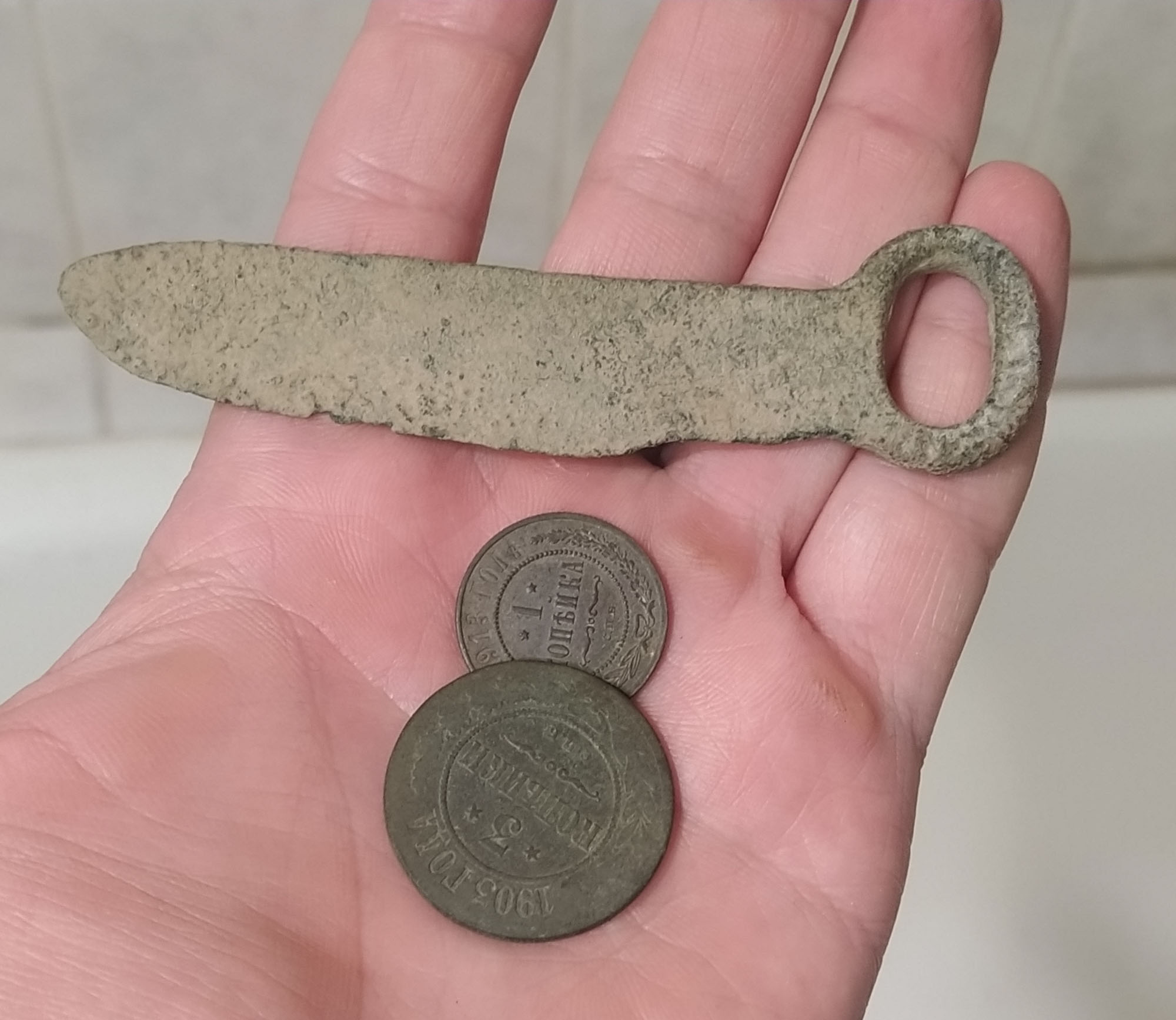 А вот такие бубенчики на 30 см звучат ещё довольно уверенно. Более крупные цели достаю с полутора штыков короткого фискаря и даже иногда глубже, но тут в основном мелочью намусорили в свое время, и есть у меня подозрение что самое интересное на этой поляне лежит там, куда я не могу не добить 14 дюймовым штормом. В связи с этим терзает мысль купить мегаруль в 20" для таких мест. Понятно что он тяжёлый, все дела, но, возможно, я получу с него те пять шесть сантиметров глубины, которые достанут то, чего я сейчас не вижу. . Найти бы героя, который успел покопать таким, но вряд-ли получится. |