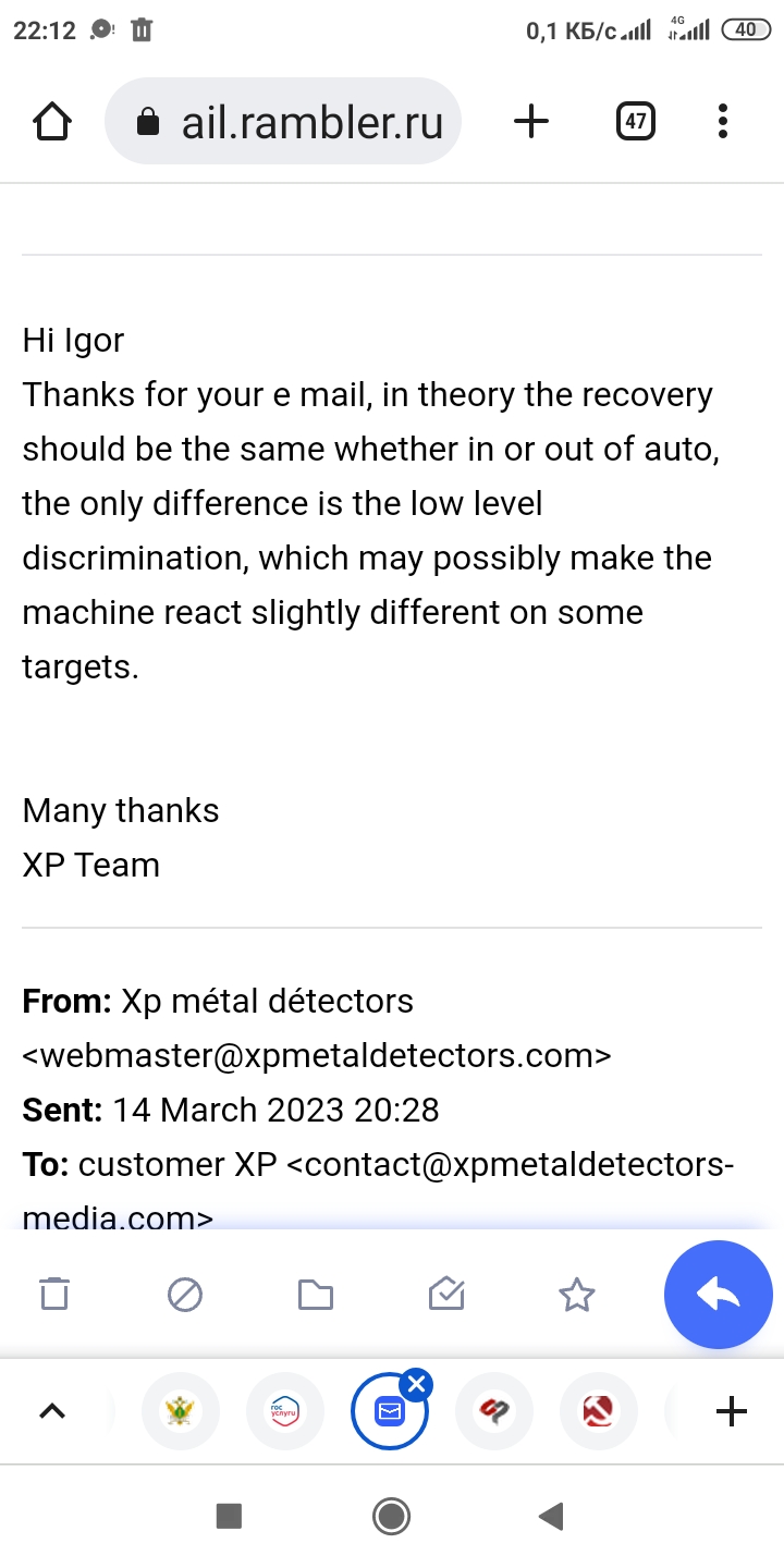Таким писакам хочется рекомендовать смотреть на заголовок темы прежде, чем что-то сочинять. Тема называется ,,Кто пользуется Gmaxx2". Для остальных, нормальных и адекватных форумчан выкладываю ответ мне службы поддержки компании xp, где в двух словах, что теоретически iron treshhold влияет на дискриминацию, но в режиме auto возможна разница в звучании отдельных целей! Вывод, как был, так и остался. Никто из владельцев джимакса никому из владельцев джимаксов ничего не навязывает, а делится своими наблюдениями и опытом. А те, кто препятствует этому процессу, устраивая разборки на пустом месте, заслуживают полного игнора и равнодушия, тем более, не имея и не пользуясь XP Gmaxx lI. Всё, не считаю нужным продолжать какие-либо дискуссии по iron treshold, а предлагаю просто делиться своими ощущениями, на каких настройках работали и какие оказались эффективными. С уважением ко всем адекватным пользователям XP Gmaxx ll Сообщение отредактировано All-searching: Mar 16 2023, 22:56 Вложенные эскизы изображений |