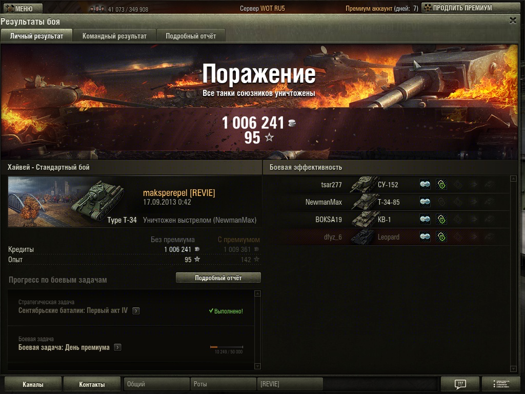 QUOTE(Charlikk @ Aug 9 2013, 14:36) Сучувствую. У меня оптоволокно кинули и теперь стандартный пинг 20-30. В прайм-тайм, когда сервак переполнен, понднимается до 80. Вылет был только 1 раз за всё время... Т-34-85 классный танк. Продавать жалко. А вот Пантера так и не порадовала. Слишком неуклюжая... |