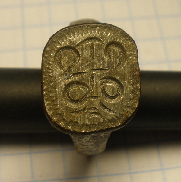 Вот брат своим скупом поднял перстенёчек, большой. Погнутый, размер щитка 21мм, общая длинна 35мм. Материал латунь(?), внутри есть остатки золочения. Перстень был в воде и поэтому подвергся сильной коррозии. Место находки - забытый озёрный пляж с находками от копеек сороковых годов до денежек и дальше ..... Есть клеймо.