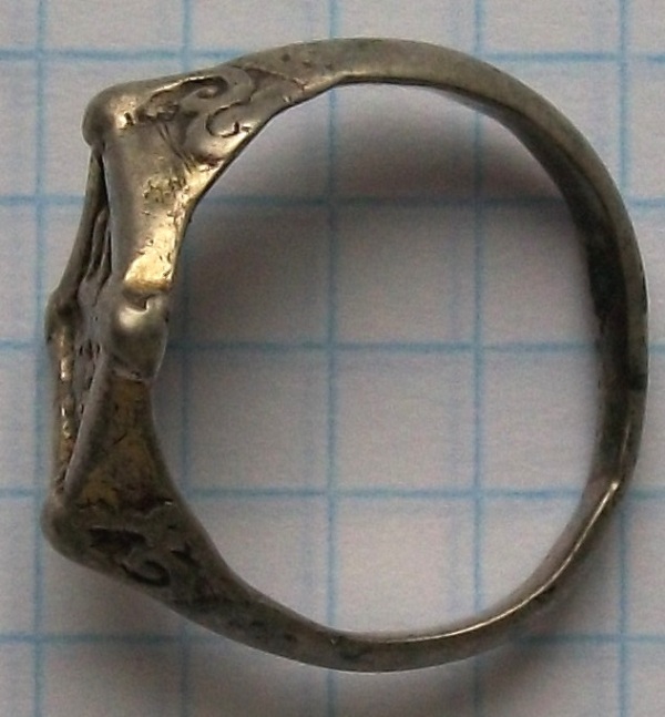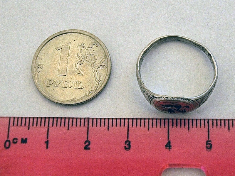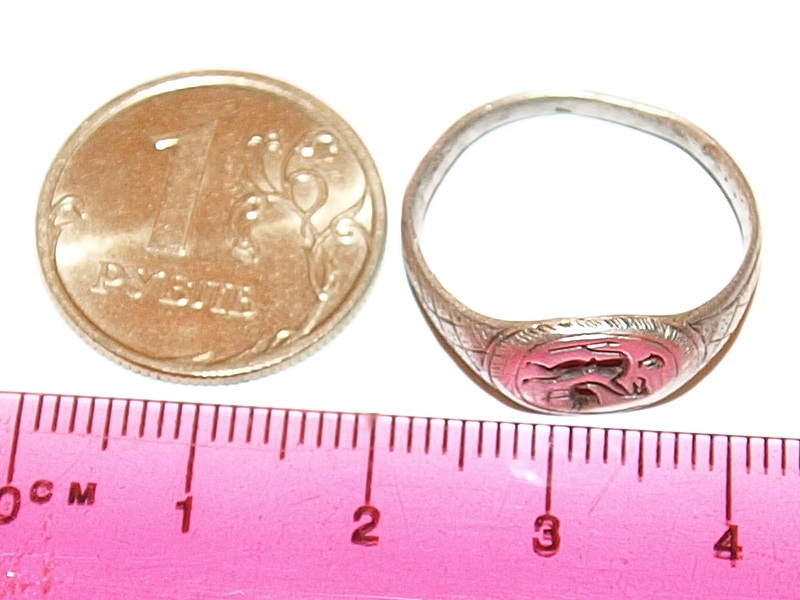 Здравствуйте, помогите, пожалуйста, датировать и оценить (если конечно что-то стоит) перстенек. Клейма не разглядел, материал определить затрудняюсь (разве что опускал в кипяток - нагревается за 1 секунду, также быстро в руке остывает - может серебро?). МД терра-705 показывает 44. Спасибо.