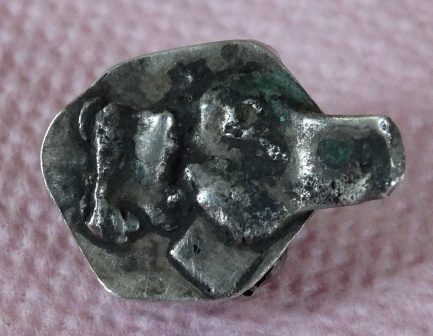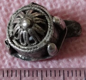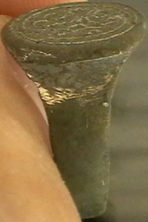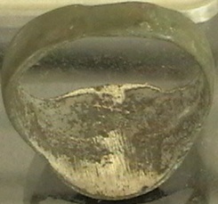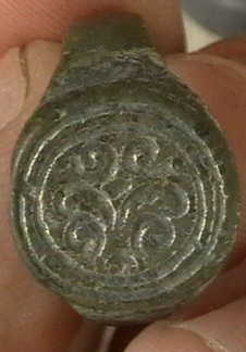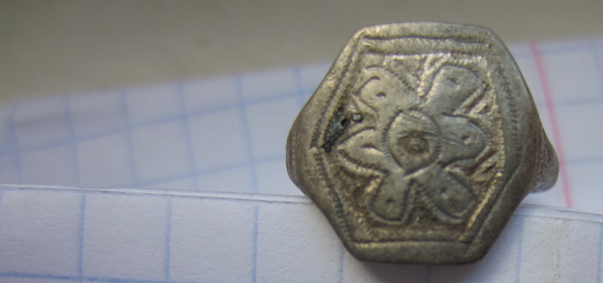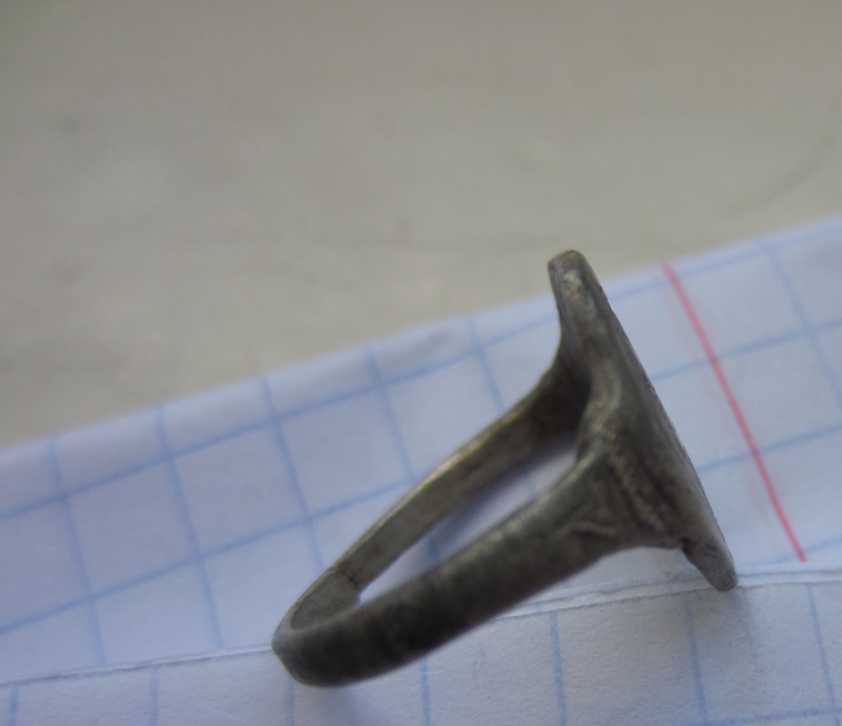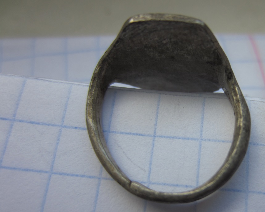 Здравствуйте, уважаемые знатоки. Вот недалеко от Каширы (Тульская область) нашел серебрянный обломок перстня. Перстней поднял не мало, но такой вижу впервые. Лежал в распашке клада дирхемов и подражаний, других сопуток не было. Помогите определиться с датировкой и происхождением.