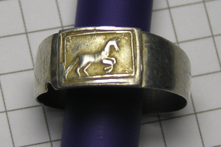 700 ₽.+\-перстень с изображением Лошади(мустанга),остатки позолоты,выкус на шинке подводит.
