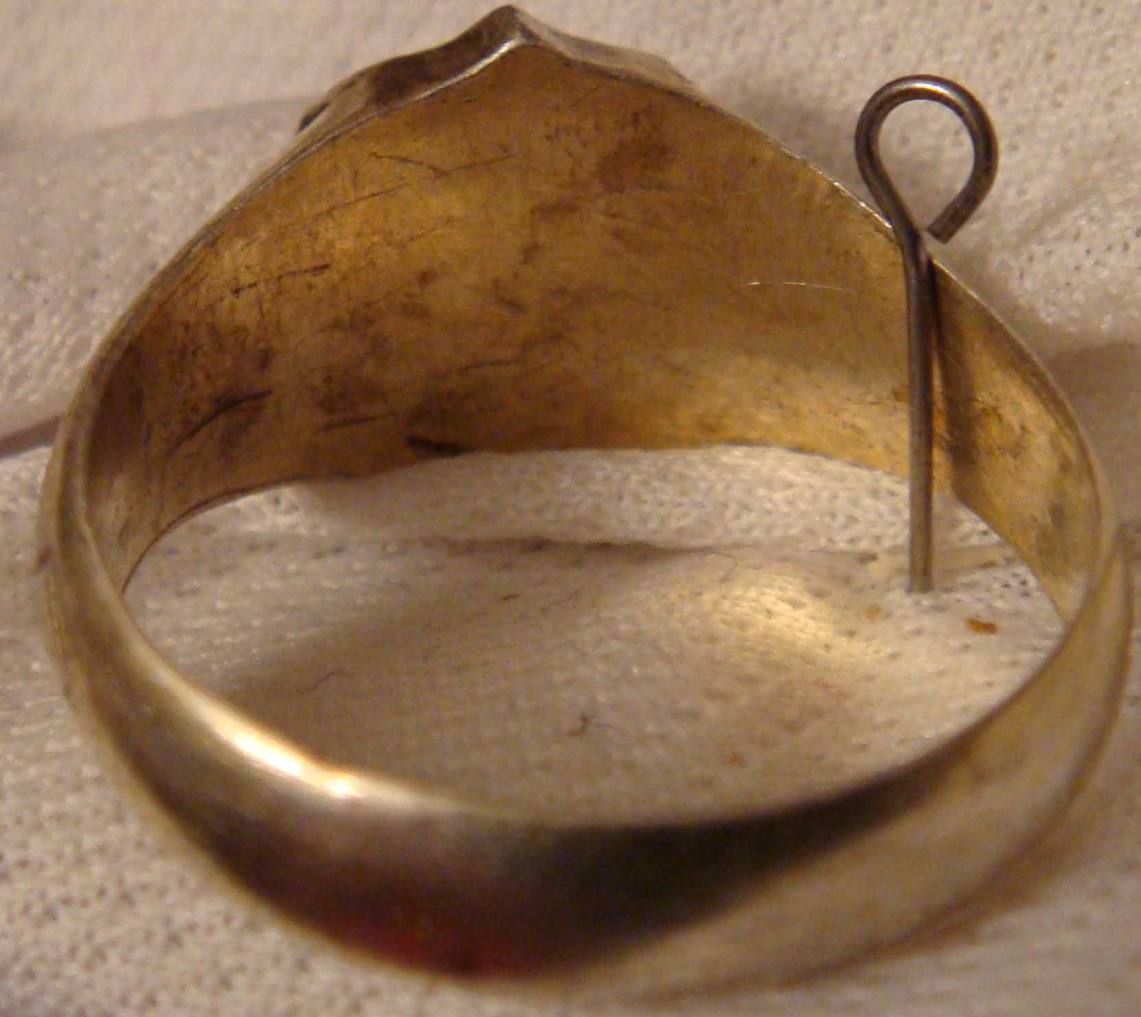Помогите, пожалуйста, установить датировку позолоченного серебряного перстня, его ориентировочную стоимость и кому мог принадлежать фамильный герб. Клейм нет, найден в Калужской области. Спасибо!