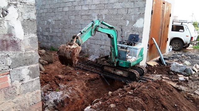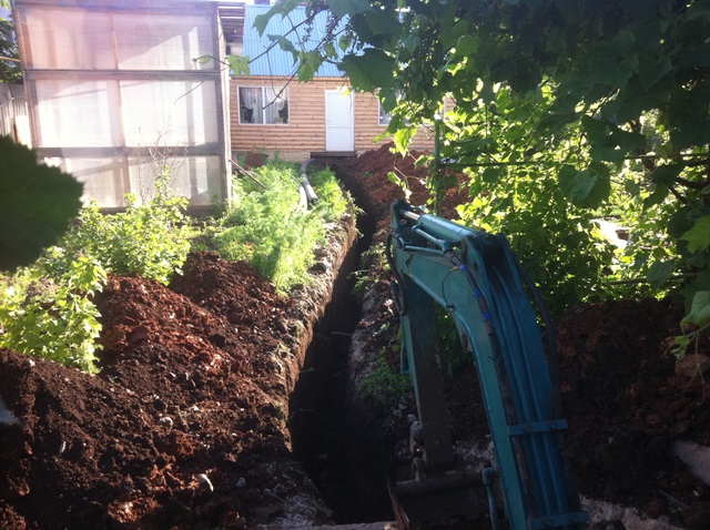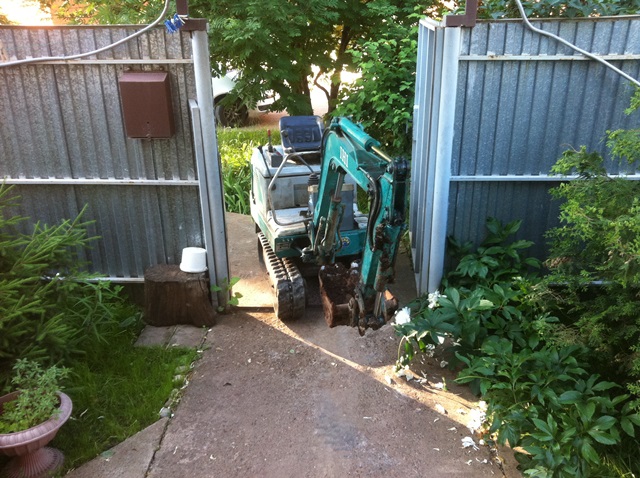 Вчера уже копал по серьезному. Приехал на объект, выгрузился, проехал через калитку, по другому никак. Вырыл траншею от дома до бани под водопровод 20 метров, глубиной 1.3м. В 8 утра начал, в 7 вечера закончил. Нет, это даже не тяжелый труд, это очень тяжелый труд