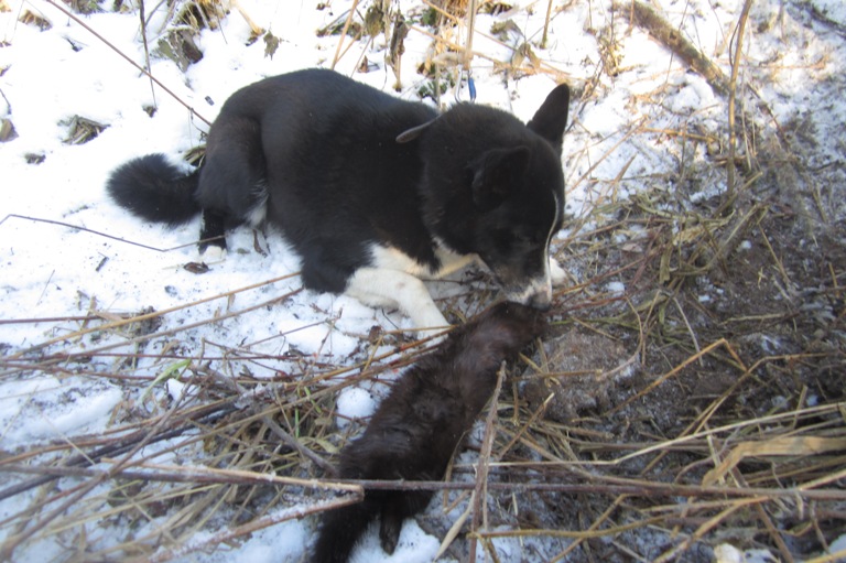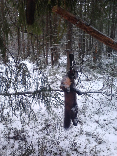 Всем привет!!! Отличившихся с полем!!! Закончил сегодня обход путиков, ситуация стабильная, в двух капканах проловы, точнее незаходы, ворует приманку сверху в противодействие подвешена на жердь под капканом, посмотрим через недельку. В одном капкане непонятка, сработан, приманки нет, всё истоптано енотом.......... Предположение что приманку(белка) стащила куница и попала в капкан и была слопана енотом, в прочем это только предположение. Пытался снять как Сэм лося работает, но в лесу очень шумно наст, свинтил, а ждать на квартальнике было ни как малость припотел и стал застывать на против лая. В капкан где до этого куница слопала приманку и сойку, была подвешена белка, на неё клюнула афро куница. В этом году самая тёмная, ранее бывали ещё темнее. Всем ни пуха ни пера!