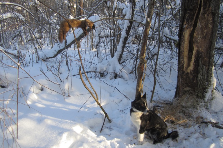 Добрый вечер! Утром посмотрел на градусник -23, выехал чуток подождав, у реки было -25, отъехал десяток км уже -28. Почесал репу, ну не ехать же назад. Пошел на круг по капканам торить первую лыжню. Отойдя пару десятков метров увидал не боящуюся нас с собакой лису, порывающуюся к нам приблизиться...вел собаку с пол-километра на поводке. В том году к тамошнему крайнему дому тоже приходила бешеная лиса, покусавшая хозяйскую собаку, которая вскоре сдохла и был там карантин по бешенству. Со снегом полная ж...па, как говорится ни пешком не на лыжах. В лесу лучше без них. Но обраткой красота! Куница не гуляла, если не считать старенький следок протяженностью метра три на наклоненном дереве. Собаке потребовалось две попытки...