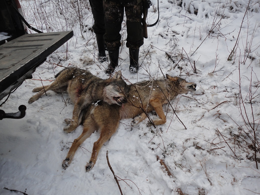 Чудеса!До обеда обкладывали одного,после обеда собрались человек 15,за час зафлажили всего км. 2,5,толкнули - один выстрел и волк добыт.Первый раз у меня такая охота,жаль фотик не брал в этот раз.Молодёжь осталась флажки сматывать,а я домой поехал - что-то сегодня мотор покалывает,походил много.Так что за 2 дня добыли 2 волка и волчицу.Обнаглели они совсем без снега нынче.