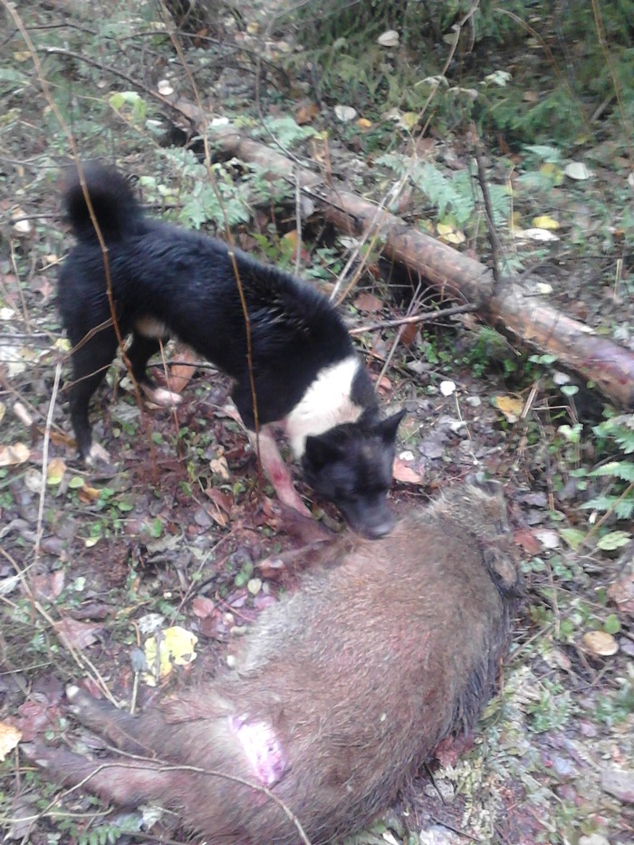 Товарищ выстрелив в лося,я слышал хлопок т.е,попадание,но лось убежал. Мы пошли по направлению лося на поиски,он забежал в болотину заросшее плотным тальником. Когда мы кромкой начали обходить его,я по запаху понял ,что лось где то здесь,мы прошли ешё дальше и запаха не стало. Тогда мы вернулись на то место где был запах и пошли в глубь болотины,когда мы прошли метров 30-40 ,там и нашли нашего трофейного лося,он был уже мёртв. Запах кабана тоже очень далеко слышно,если он где то рядом, или даже был на этом месте. |