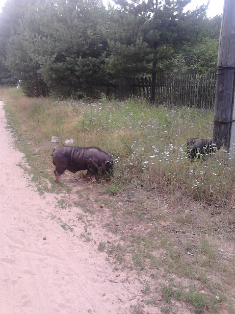 Прошлым летом со мной приключилась такая история. Супруга моя имеет такой обычай, выезжать летом на родину, берег Рыбинского водохранилища. Ну там родственников навестить на кладбище у родных прибраться. Места там знатные бор сосновый на десятки километров тянется, Волга широченная, одним словом красота. Ивот посреди этой красоты и тишины детский и бабий крик КАБАНЫ!!! На ходу соображая где мои жена и сын годовалый, лечу в направлении крика. Стайка детворы и чересчур возбуждённая тётка, наперебой пытаются объяснить мне как на них в лесу напали кабаны. Ружьё дома, с собой нож охотничий и Сэм. Хорошо что не стал пороть горячку и пошол разобраться без Сэма. Кругом копки, следы прямо на краю деревни в заброшеных огородах. вдруг трава зашевелилась, захрюкала и на лужайку выкатила вся чесная компания. Я чуть от смеха не помер, до того они потешные были. Оказавлось ещё неделю назад они сбежали с охот базы, а егерь ну ни как не мог их найти, идти домой у них небыло никакого желания.