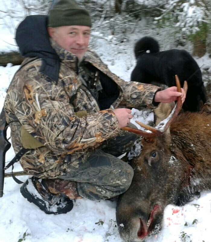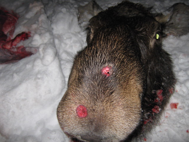 QUOTE(Железнёвский @ Dec 8 2013, 21:46) Добрый вечер! Палыч с полем! Сегодня меня забрал на охоту, друг говорит что не как не могут добыть лося. В загоне мне номер достался в завалах, почти на конце просеки, ветром завалило всю просеку, при добыче лося придётся таскать мясо метров двести по корягам. После начала загона прошло наверно минут 20, смотрю прямо на меня бежит лось, я стреляю дважды прямо в голову, лось убегает, но после третьего выстрела лось споткнулся но скрылся за кустами. Я думаю, не ужели промазал. Лось на последних силах нарвался на номер, который стоял на краю завала, куда спокойно подъехали на машине. Пулевые дырки на фото, как мог столько пробежать. С полем. Классные выстрелы++. Это у него агония была. Звери могут и больше пройти будучи смертельно раненые. С ув. Палыч. -------------------- Все снасти от лукавого,и только сети от Бога.