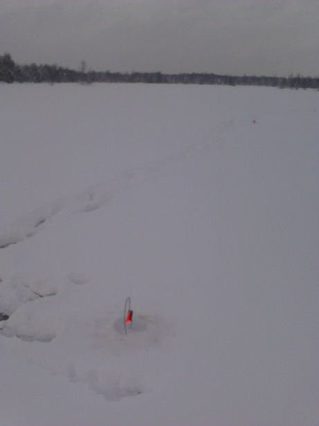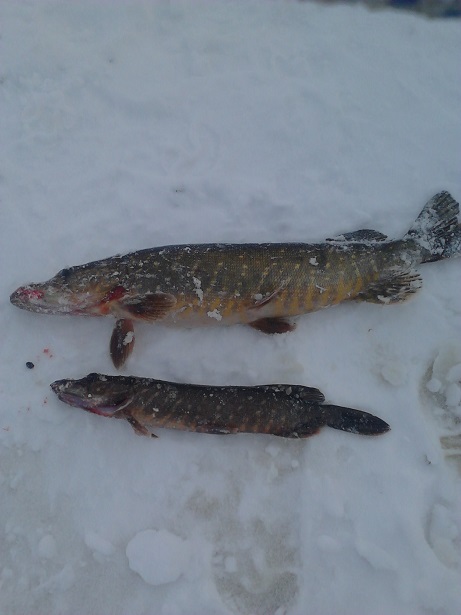 Вот и дождались сезона, сгонял на перволёдок, предварительно созвонился с друзьями узнал чё да как, они говорят мол сами не ходили но вот их знакомые ловят........... Тропинка к заветному карьеру протоптана, да на снегоходе проехали пару раз, женщина которую подвозил по дороге мне с уверенностью сказала, что мужики вчера ходили и щук наловили, это придавало дополнительных сил. Ну вот я и на льду сделав несколько уверенных шагов лёд подомной начал предательски хрустеть, спешу скорей назад, собираю бур, полтора оборота и бур проваливается в чёрную тугую воду торфяного карьера, измеряю пальцами толщину примерно 4-5см, мама, выдавил я из себя и сглотнул комок в горле. Тут на память пришла поговорка ..........осенний лёд, трещу но не пущу.................., а во мне 125кг плюсом зимняя одежда, жерлицы, бур, прочая амуниция и в обратку 4 км до машины так не хочется ползти по сугробам. Краем, краем пробираюсь на своё любимое место, с мурашками по спине и холодком в одном интересном месте при очередном потрескивании и проседании льда выставился наконец. Вот и первый флажок загорелся, подсечка, короткое вываживание и на льду первый в этом сезоне шнурок. Ну от нуля ушёл, обнадёживаю я сам себя. Спустя почти час ещё сработка, подхожу, не мотает......... делаю подсечку, на другом конце лески кто то серьёзно против того что его побеспокоили. Минута и на просевшем подо мной льду красавица щука, ещё не осознавшая всей тяготы своей судьбы недоумённо замерла у лунки. Это была крайняя в этот день поклёвка, итог две поклёвки две щуки. Уже вечером у шкворчащей на сковороде икры с аппетитными кусками щуки и конечно под чарку холодненькой самогоночки я ещё и ещё раз за разом проигрывал в уме варианты развития событий. Но всё опасения и невзгоды перечёркивает, вдруг вспыхнувший в белом безмолвии яркий флажок жерлицы.