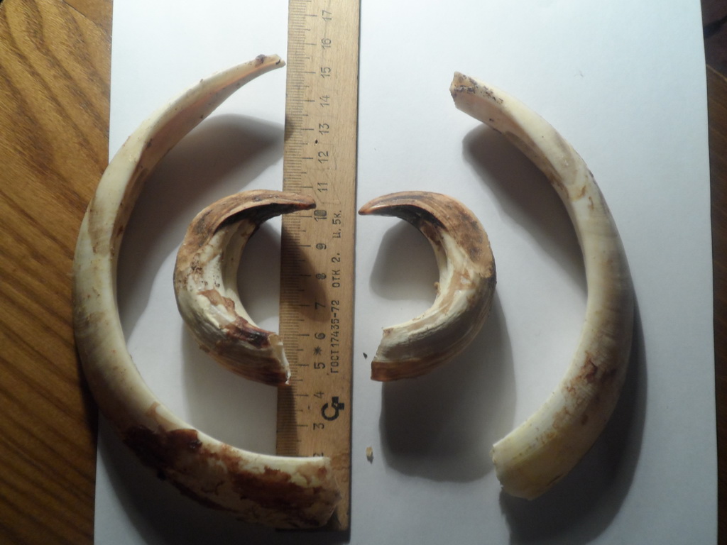 чтото тема заглохла ,расскажу историю которая произошла в сентябре 2013 года ,при охоте на овсах с моим отцом ,был подстрелен кабан но в силу того что не был убит наповал сразу,что часто бывает с этими сильными на рану животными ..дело было глубокой ночью,решено было добирать утром,с утреца батя с другом в ожидании всего наилучшего ринулся в лес как оголтелой ,буквально метров через 200 по кровям вепрь был обнаружен ,но он оказался жив ,со слов отца ....успел отпрыгнуть в сторону и смех над другом который успел залезть на дерево без суков ...потом было не до смеха жгучая боль в левой руке ...итог увезли в больницу распор руки от запястья до локтя ,добирали уже другие коллеги с собаками ,а отцов дружбай больше в лес не полез,а отцу привезли в больницу клыки того кабана на память ...а он мне чтоб я их на медальон к его 60-ти летию оформил ..так что будьте аккуратней вот такая вот история .. у меня была наподобие но с барсуком ..ну и фото клыков того людоеда,длина левого клыка 22,5 см