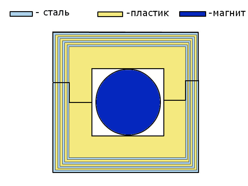 Экранировать магнитное поле можно, и в принципе не очень сложно, но проблема в том, что экранирование немагнитными материалами малоэффективно, а от магнитных магнит еще отодрать надо. Несколькими слоями стали с пластиковыми прокладками между ними можно экранировать, но нужно еще создать немагнитный слой,который даст возможность без особых усилий извлечь магнит из бокса,а это плюс еще сантиметр-полтора. По идее выглядеть может вся конструкция вот так. Для моего магнита (50мм*35мм) размер бокса составит приблизительно 100мм*100мм*85мм, что в принципе не критично для перевозки. Бокс должен открываться так, чтобы за магнит можно было ухватиться. Мой магнит без болта для отрыва, просто цилиндр без отверстий и выступов. Однако сооружать такую конструкцию немного геморройно. Собираюсь сделать, как сделаю - выложу фото. По идее дстаточно взять любую коробку подходящую по размеру и на клей посадить слои чередуя их.