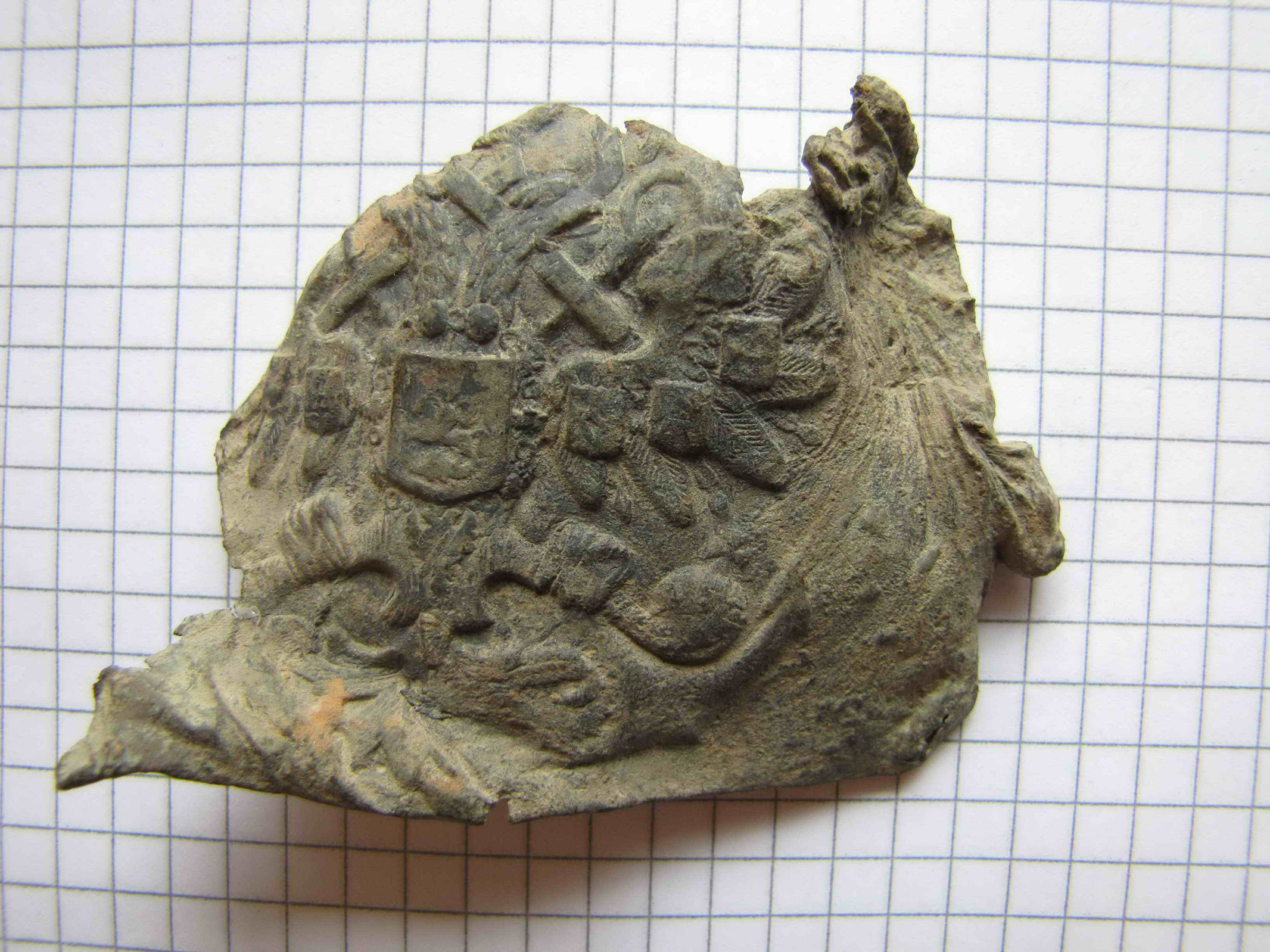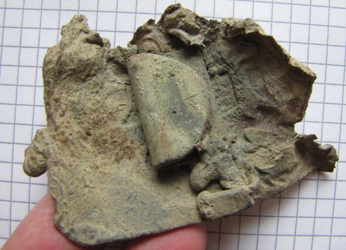 Коллекция небольшая. Одна гвардейская бляха (томпак) и две латунь. Всего три штуки. Нужно проверить царские документы на соответствие химического состава флотских блях. Вопрос не в этом. Попался фрагмент бляхи. Фото во вложении. Не было времени чистить, убыл в командировку. Успел только привезти из Питера с почты. У меня вопрос к Копателям-профи (с большой буквы) - остатки бляхи имеют следы оплавления по краям. Это что? Попал раскаленный осколок снаряда прямо в бляху? Бойца соответственно тоже. Что делать с этой бляхой не спрашиваю. Мне это понятно. У меня их более 230 штук флотских. Освятим, отпоем в нашем православном морском храме на Вышгороде в Ревеле (Таллине), на день военно морского флота России в этом году в июле месяце. Эти оплавленные повреждения бляхи от осколка снаряда? Сообщите свое мнение, пожалуйста. Почему расплавились края бляхи и металл вылетел в виде капель от скоп под ремень и т.д.? -------------------- Главное в жизни - это не лениться. Захотелось поспать - поспи.