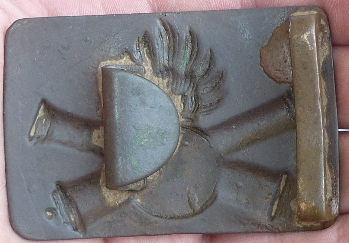 Нужна помощь в определении,это пряга если да то кто носил или просто какая то накладка?Найдена на фундаменте в Лен.обл.,сопутка:монеты А-2,А-3,Н-2,пуговицы с якорями русские,финские,одна немецкая,якорь с погона и др.