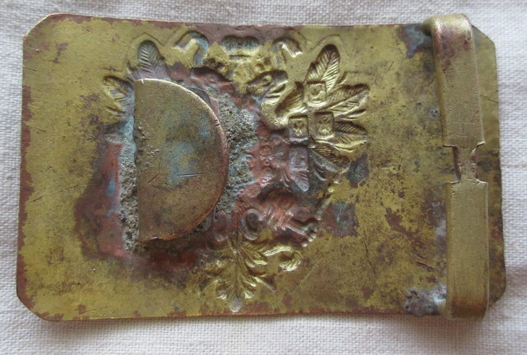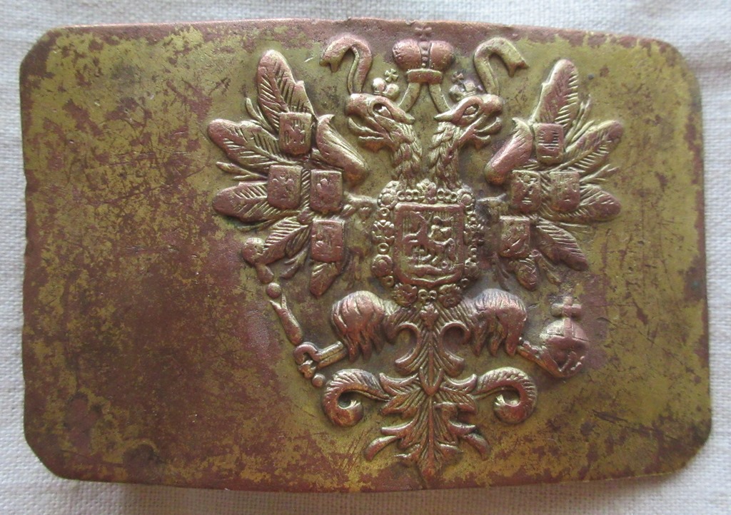 Здравствуйте! Такая вот пряга попалась, в таком исполнении встречаю впервые. Красная медь ( чуть зачистил надфилем с торца), жёлтое матовое покрытие, что то типа позолоты. 83 на 52 мм.,орёл чуть смещён. Какой период изготовления, кто носил?