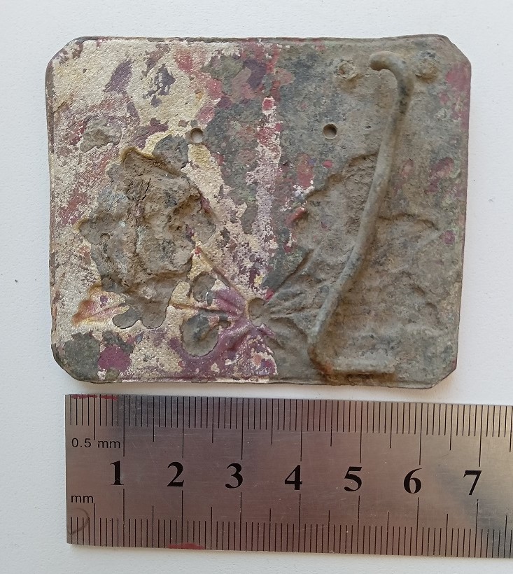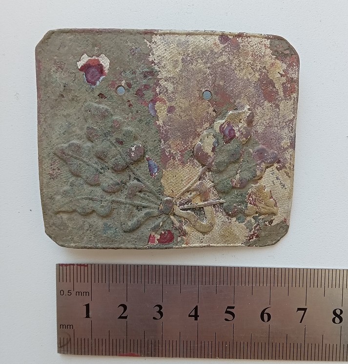 Доброго дня всем!Вчера на копе попалась такая бляха,сохран конечно так себе,видимо лежала рядом с какой то тканью,поэтому она до половины в патине остальная часть без.Судя по 2-м отверстиям над ветвями,был накладной элемент,его не нашел,размер 6,5х5,5 см..