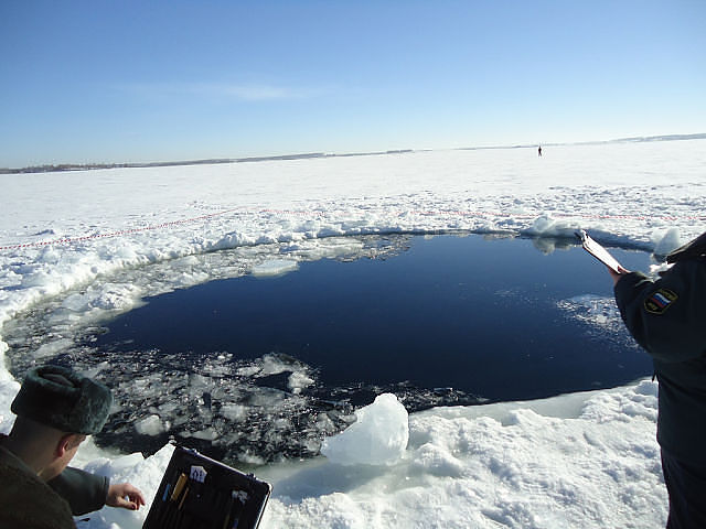 Сейчас показали пробоину во льду у Чебаркуля диаметром 6 метров. Все места падений обломков оцеплены военными, МЧС и полицией. Самые большие куски им достанутся.