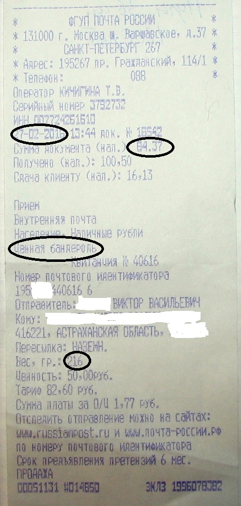 QUOTE(Виктор Васильевич @ Feb 29 2016, 20:18) Чтобы не было между мной и Siniy Borod недоразумений, сфотографировал, обработал, выложил в интернет на пользу нумизматов. Вот квитанция 27.02.16, наименование ЦЕННАЯ БАНДЕРОЛЬ, вес 216 гр., оценка 50 рублей, сумма на кассе 84 рубля 37 копеек. Ну и пакет стоит 15-27 рублей. Три пятака Екатерины с упаковкой обычно весят около 200 гр., 300 чешуек с упаковкой тоже примерно так, поэтому на дату февраль отправить лот за 100-120 рублей и даже с упаковкой и даже оценкой реально. Прилагаю фото квитанции. P.S. Уже за апрель 2016 не отвечаю, только за 27 февраля 2016, когда отправлял книгу 216 грамм. По-моему оператор ошиблась и не пробила Вам 82,6 в графе "тариф" внизу за ценность отправления и плюс 1,77 за о/ц. Просто лоханулась. То есть общая сумма отправления должна была быть 168.74р. Вам повезло. -------------------- Ишь ты...