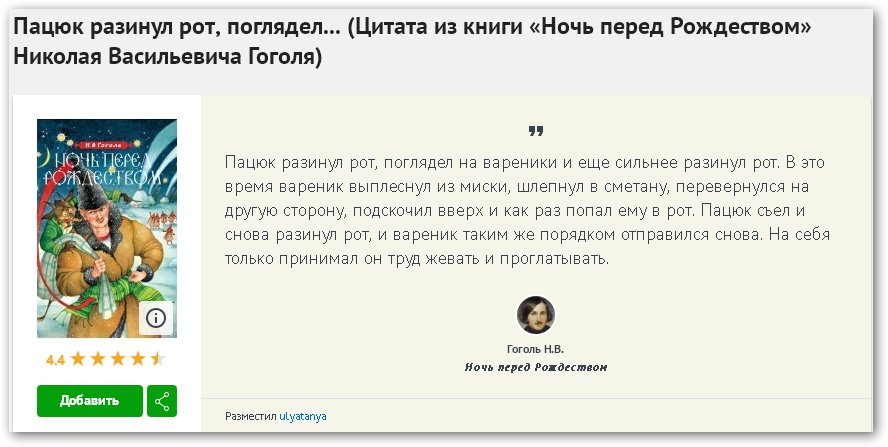 QUOTE(Родя @ Feb 21 2019, 22:58) Вспомним классику "..Пацюк разинул рот, поглядел на вареники и еще сильнее разинул рот. В это время вареник выплеснул из миски, шлепнул в сметану, перевернулся на другую сторону, подскочил вверх и как раз попал ему в рот. Пацюк съел и снова разинул рот, и вареник таким же порядком отправился снова. На себя только принимал он труд жевать и проглатывать.." Кто первый угадает вспомнит откуда это - плюс в репу )) Я и так вспомнил, но найдутся те, кто воспользуется поиском... Вложенные эскизы изображений -------------------- Копая там, где ты копал, вопрос простой, -а ты там клал?