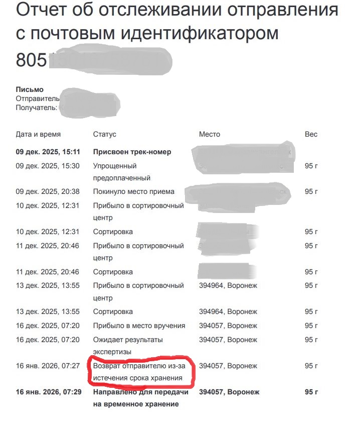 QUOTE(dezur @ Dec 17 2025, 01:06) Недавно отправил в Воронеж по почте заказным письмом 11 монет. Оформил и оплатил онлайн. Так уже отправлял, всё доходило без проблем. Габаритные и тяжёлые предметы отправлял посылкой. А 11 монет решил отправить письмом. Оператор на почте приняла без вопросов. Письмо прибыло по адресу в почтовое отделение получателя. И вот сегодня при отслеживании этого отправления увидел следующее сообщение: "Письмо в Воронеж, трек №..., от кого, кому, "Ожидает результатов экспертизы". Что за фигня?! Какой такой экспертизы?! На предмет вложений в письмо или что то другое имеется в виду. У кого-нибудь из коллег был такой опыт? Поделитесь мнением. Думаю всем будет интересно. QUOTE(Narval @ Dec 17 2025, 22:37) ... Держите в курсе, чем закончится. История продолжается! Сегодня на сайте почты, просматривая статус того самого отправления, обнаружил очередную странность. Теперь там пишут, "Возврат отправителю по истечении времени хранения". (Это при том, что письмо благополучно получено адресатом). Чудит Воронежская почта! Ну, посмотрим, что они мне вернут. А то и в розыск объявлю. Вложенные эскизы изображений -------------------- В жизни каждого мальчишки наступает момент, когда ему хочется копать землю. (с) Марк Твен.